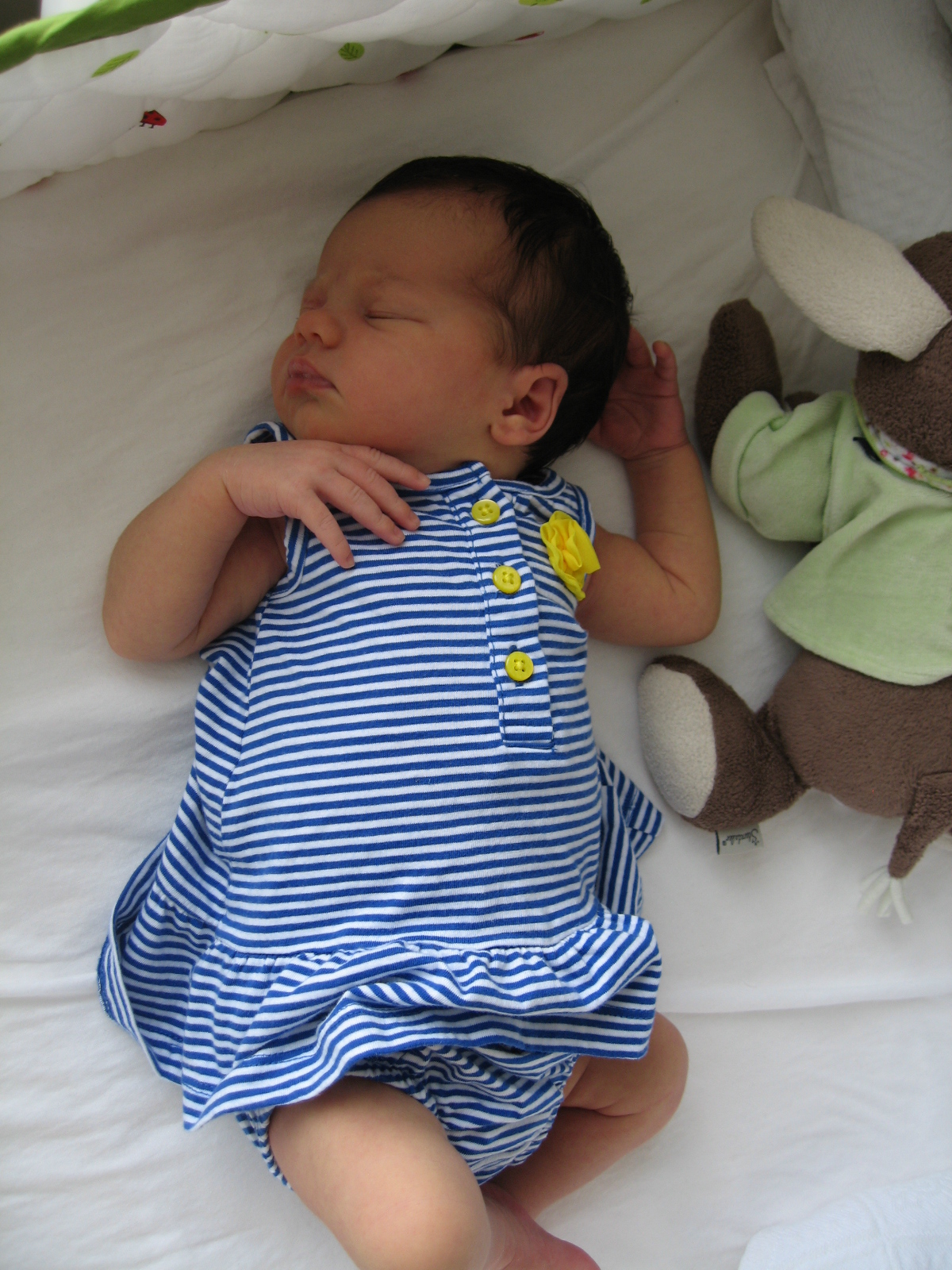 Kayla schläft voll super und ist auch sonst echt ein tolles Mädel und sehr easy going. Ihren ersten Besuch beim Kinderarzt hat sie mit Bravour überstanden. Auch ihre ersten Ausflüge zum einkaufen, in die Bücherei und an den Pool hat sie gut gemeistert. Sie wird von allen Leuten mit Begeisterung in dieser Welt willkommen geheißen und bewundert. Sie ist echt eine Schönheit!