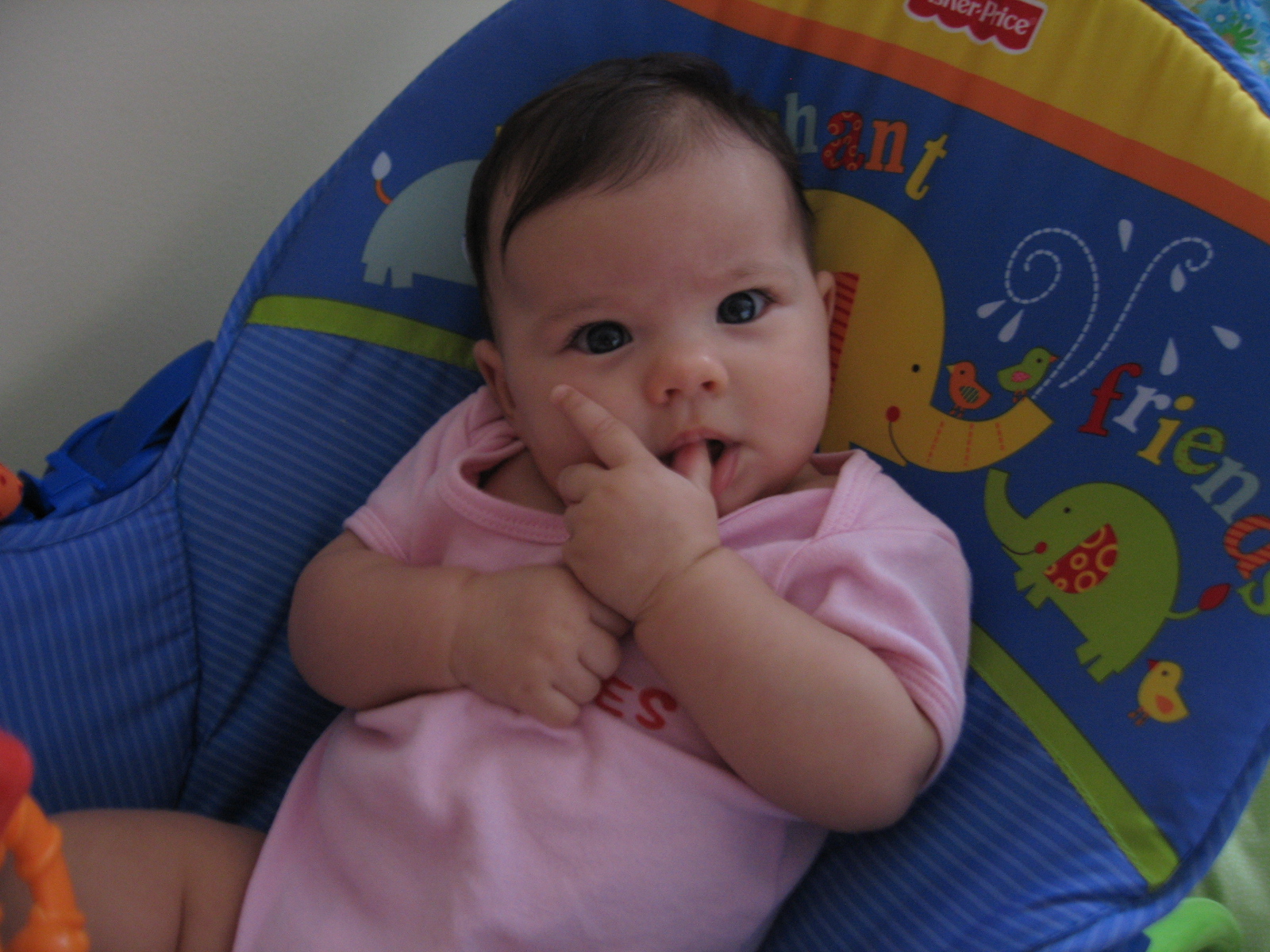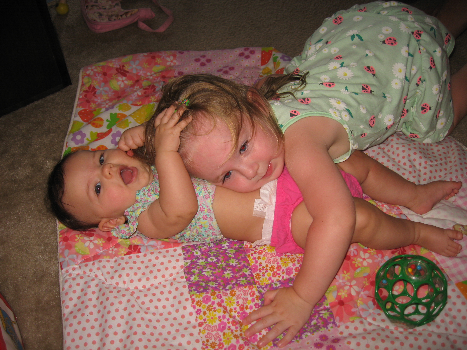 Magali ist eine tolle große Schwester und kümmert sich super um sie. Wenn sie zusammen im Zimmer liegen und Kayla weint, fängt Magali an zu singen: „Ja, Gott Kinder lieb“ und sonst legt sie grad immer ihren Kopf auf Kaylas Brust und lässt sich von ihr an den Haaren ziehen oder sie zeigt Kayla unsere neuen bunten „Pagnete“ am Kühlschrank und sagt: „Kuck mal Kayla“. Wenn sie allerdings grad trotzig ist oder was nicht darf sagt sie : „Kayla weg, Kayla weggehen…“, wenn sie dann wieder besser gelaunt ist: „Kayla Kuss geben“. Ganz normal eben.