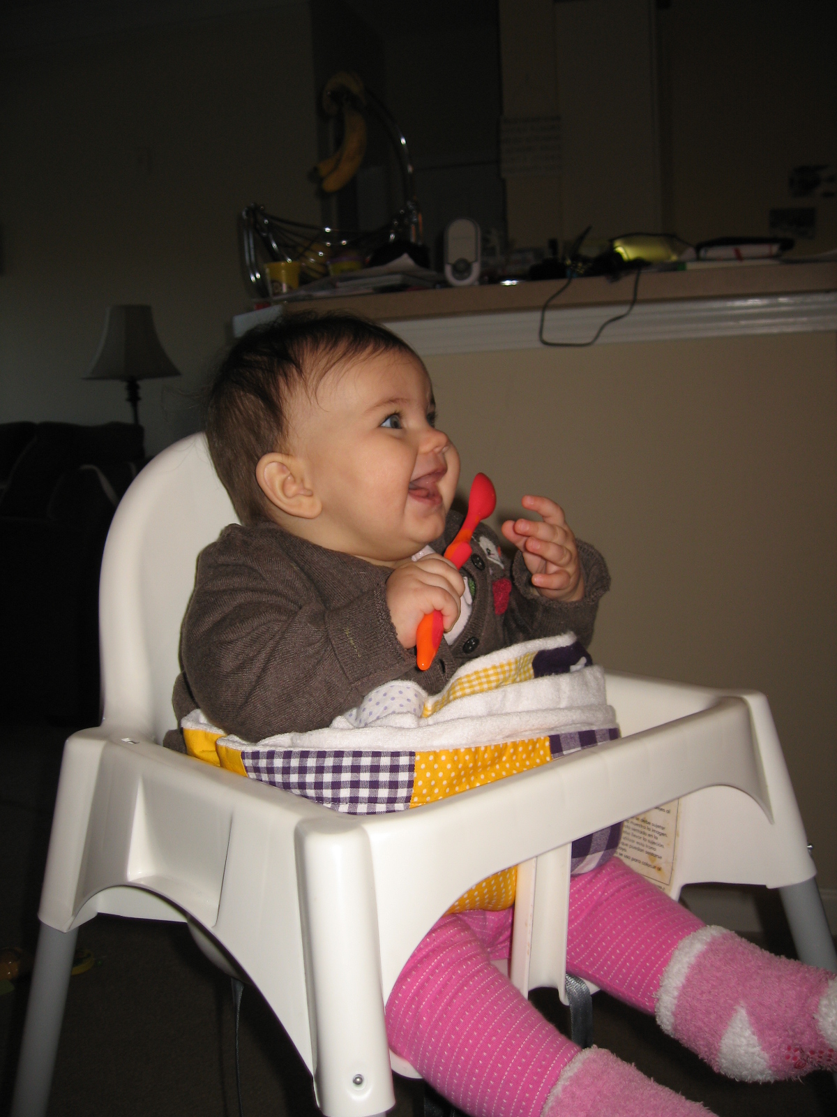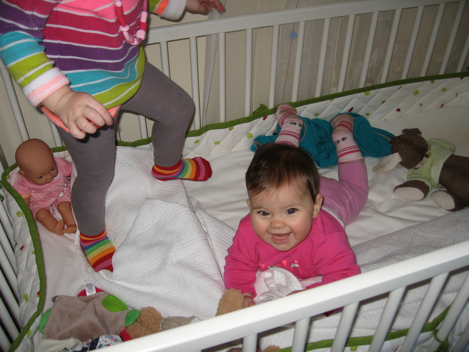 Kayla schreit grad in ihrem Zimmer. Sie hat sich wieder an hier gewöhnt und schläft einigermaßen gut. Sie robbt lustig weiter und wird immer schnell und drückt ihren Po hoch. Sie sagt MAMAMA und BABABA…..hört sich wirklich echt an🙂 Sie hat ihre erste Impfung ohne auch nur einen Mucks zu sagen oder schreien gemeistert und isst jetzt ganze Kindermenüs mit Fleisch….yummy!!! Was sie sonst noch so macht, habt ihr ja letztes Mal gesehen…vieelen lieben Dank auch noch für das Mitleid🙂 Jetzt ist Kayla grad in der Wippe im Wohnzimmer eingeschlafen. Danke.