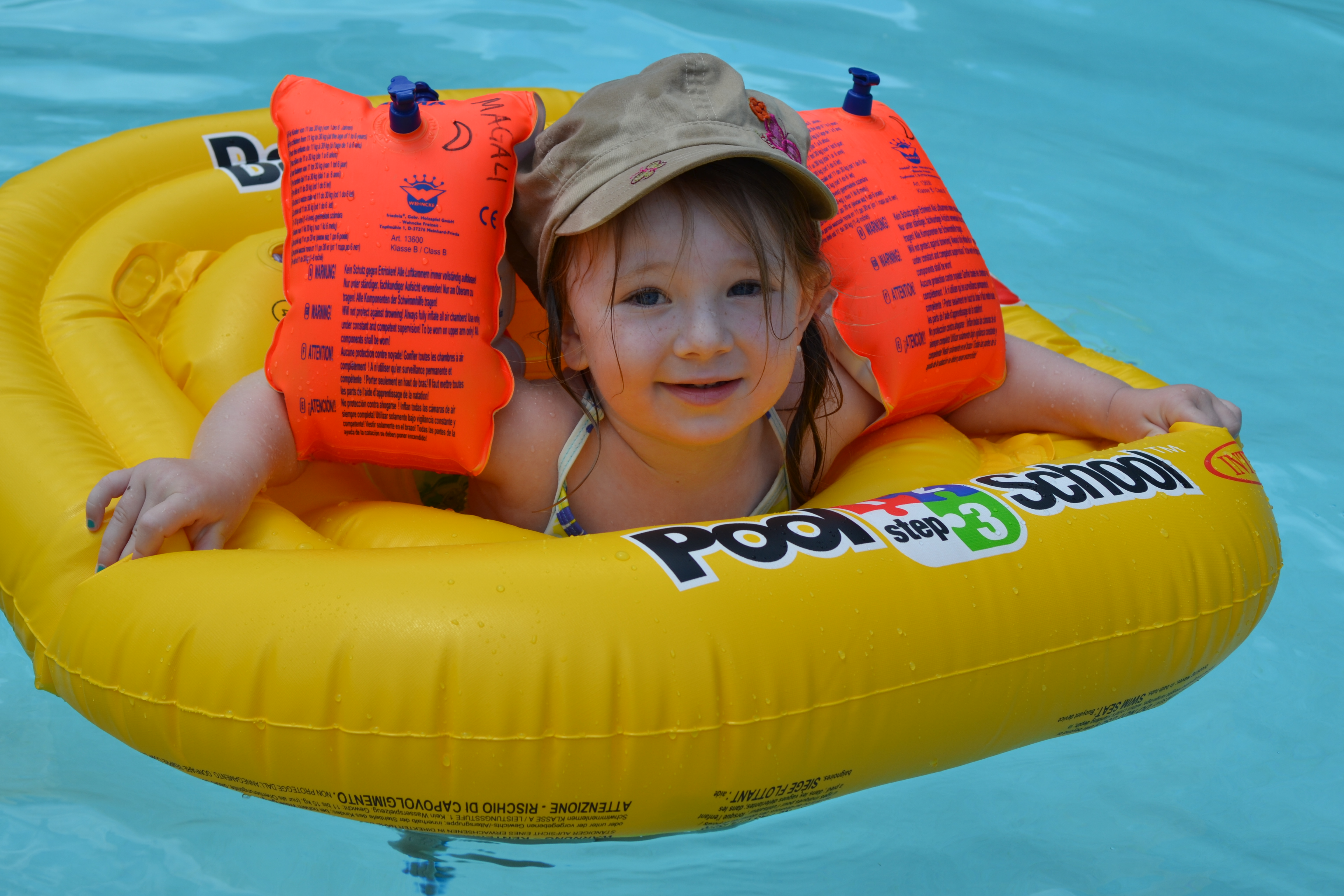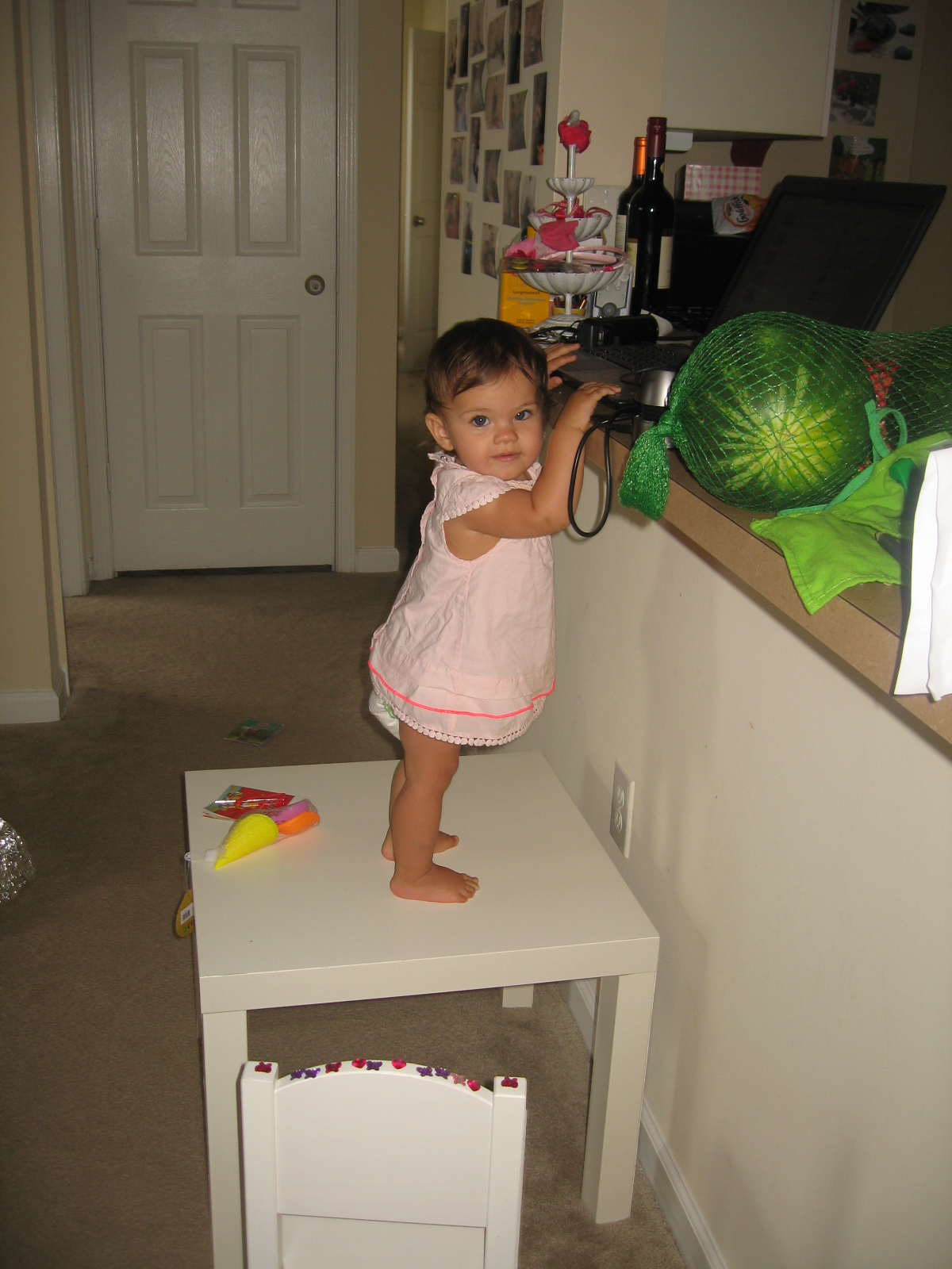 Kayla´s Lieblingswort ist gerade: „Aua“. Sie hat voll die Reibeisenstimme und benutzt das Wort bei jeder passenden und unpassenden Gelegenheit. Da sind wir einkaufen und die ganze Zeit sitzt sie im Einkaufswagen:“ Aua, aua, aua“. Die anderen Wörter die sie kann sind „Mama“ und “Baba“. Sie hat allerdings nicht viel Zeit zum reden, weil sie ständig damit beschäftigt ist, irgendeine Art von Treppe zu finden, wo sie irgendwo hochklettern kann. Am Liebsten turnt sie auf dem Sofa herum und lässt sich zusammen mit Magali in die Polster fallen. Und auch auf dem Trampolin hebt sie sich fest und hüpft. Sie hat so eine mega Körperspannung und man hat das Gefühl, dass ihr Körper voll durchtrainiert ist, ohne ein Gramm Fett. Am Liebsten grinst sie mit ihren zwei Zähnchen in die Welt hinein.