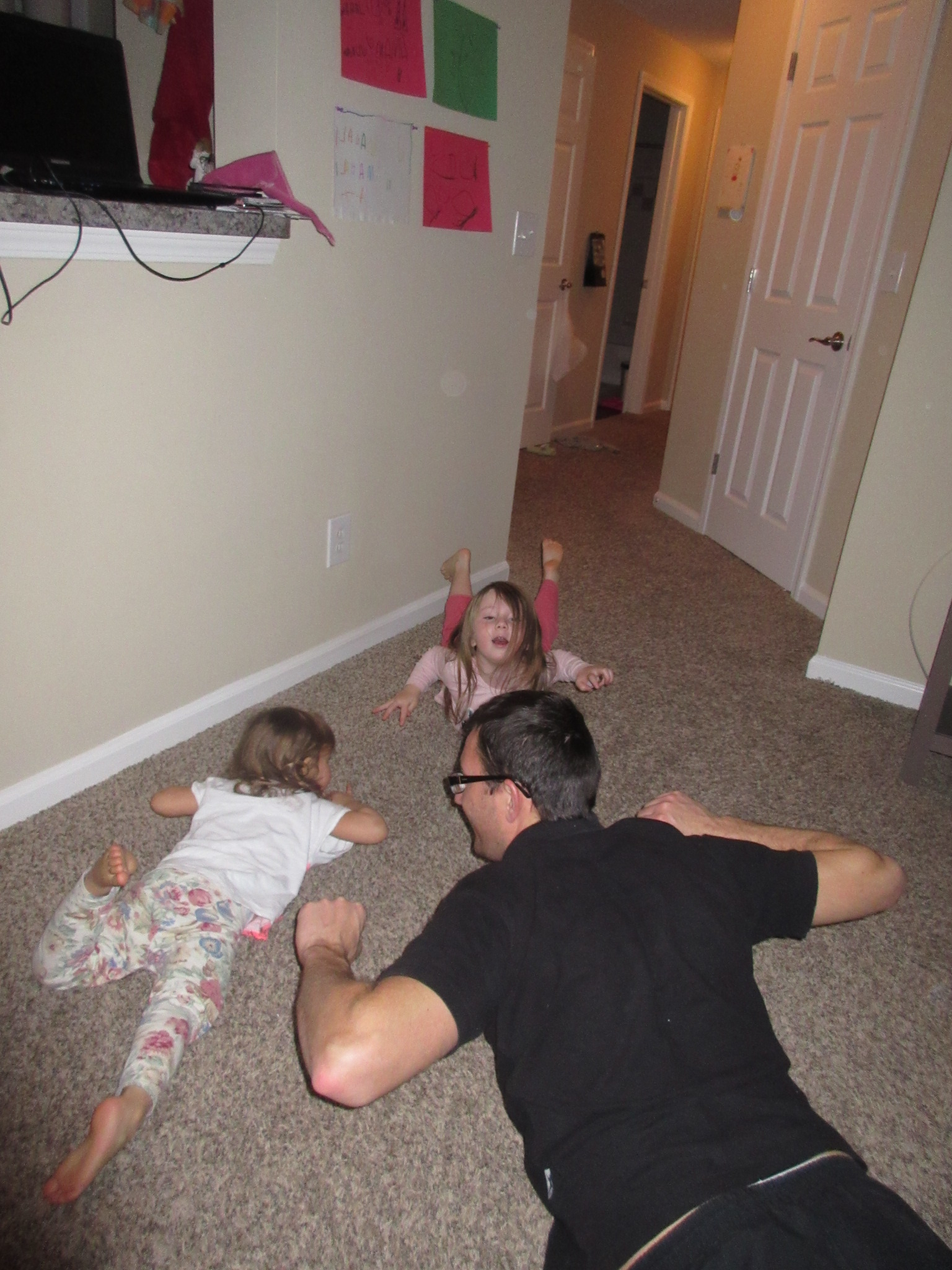 Aber ist auch kein Wunder, seit Neuestem machen die beiden grossen Mädels mit ihrem Papi Krafttrainingsübungen. Abends wenn er seine Bauchmuskel- und Rückenübungen anfängt, legen sie sich neben ihn auf den Boden und machen voller Elan mit. Und heute waren sie zum ersten Mal hier im Kinderturnen. Haben es echt gut gemacht. Kayla zusammen mit mir und Magali alleine bei den Größeren. Sie hat sich tapfer geschlagen, obwohl sie schon bissle Schiss hatte, wenn sie was nicht versteht. Aber sie ist eine Kämpferin. Vorher hat sie im Bett ganz stolz gesagt: Heute hab ich die Angst besiegt. Der Teufel hat verloren, ich habe gewonnen. Nach theologischer Korrektur ihrer Mutter: Jesus und ich haben gewonnen.